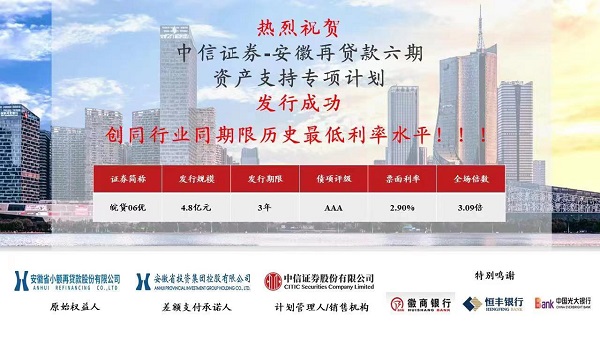 9月15日,“中信证券-安徽再贷款六期资产支持专项计划”簿记圆满成功,项目规模5亿元,其中优先级4.8亿元,3年期发行利率2.9%,全场认购倍数3.09倍,创同行业同期限历史最低利率水平!