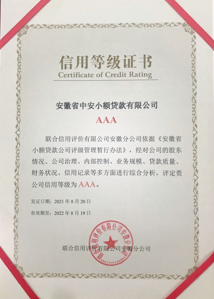 近日,省地方金融监管局委托联合信用评价有限公司对中安小贷公司开展了2020年度监管评级工作,对公司的股东情况、公司治理、内部控制、业务规模、贷款质量、财务状况和信用记录等多方面进行了现场尽调和综合分析,最终评定信用等级为aaa。中安小贷公司是芜湖唯一一家在当地注册和经营获aaa等级的小贷公司。